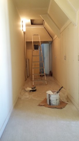 Après la rénovation de la 7ème salle, tant qu’il reste un peu de courage … de l’enduit et de la peinture, en route pour la rénovation du couloir du second étage du musée Artcolle.