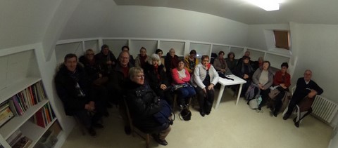 Conférence sur l’histoire de l’art du collage du XIIème siècle jusqu’à nos jours avec un groupe de 21 personnes de Vannes – dans la toute nouvelle salle dédiée aux conférences, aux animations, et au centre de documentation sur l’art du collage du musée Artcolle. Au plaisir de partager sa passion s’ajoute à chaque conférence quelques écus pour le musée de l’art du collage. Preuve que la parole d’un pot de colle – il s’agit de ma pomme - peut rapporter quelques futurs pots de peinture …